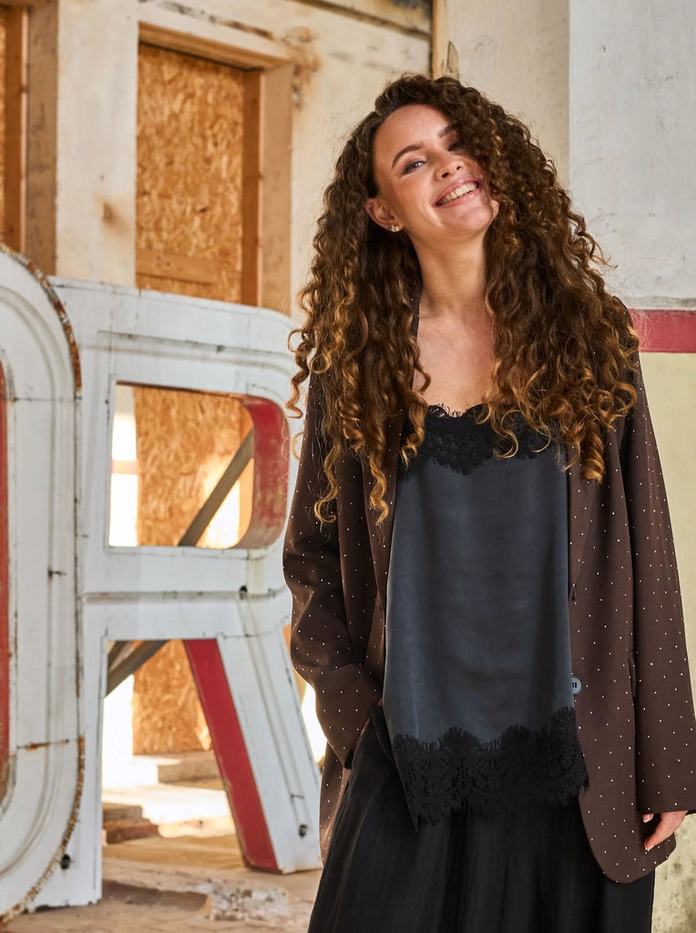 The Evie top is a beautiful top with elegant black lace edges. The top has thin straps and a loose fit that gives a light and flattering look. The fine lace details along the neckline and bottom add an exclusive and romantic touch.