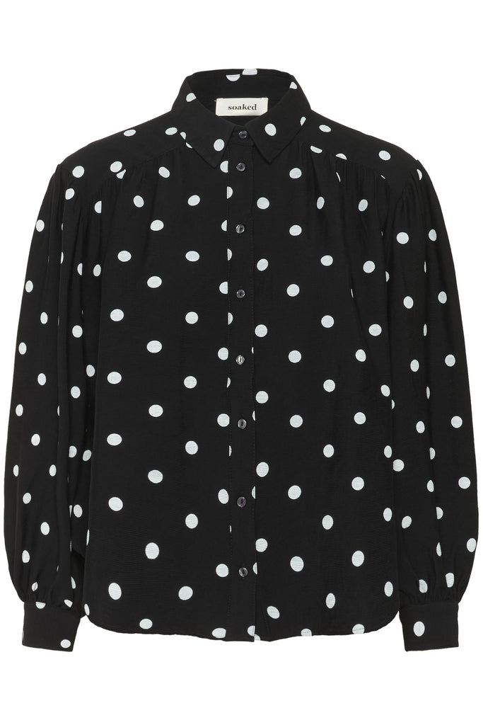 Long sleeved polka dot shirt in black.