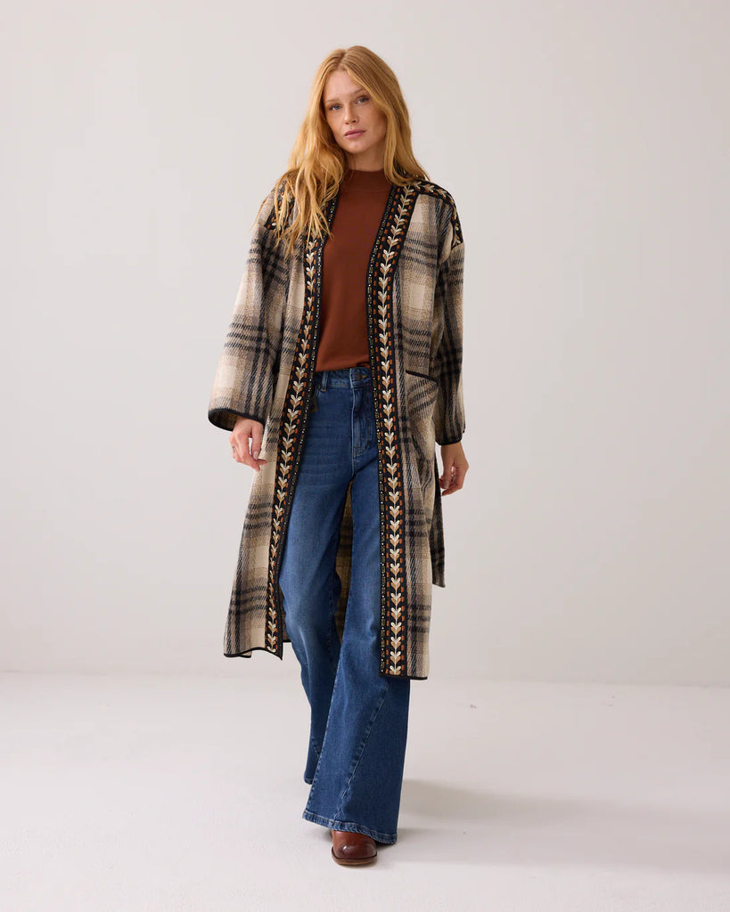 A mid-calf-length Bohemian jacket in a chunky check pattern. The jacket is decorated with rich embroidery on the front and back.