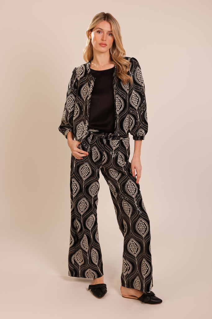 Our Paddle jacket is a savvy blend of comfort and fashion. This cropped padded jacket has a chic boxy style fit, with a round neckline and 3/4 puff sleeves with an elasticated cuff. So stunning in this black and white embroidered and sequined cotton.