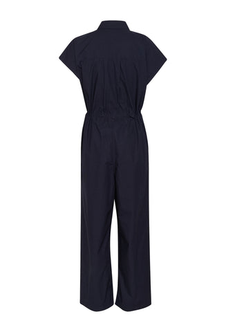 This navy blue jumpsuit blends style and comfort with its relaxed fit and adjustable waist. The short sleeves and classic shirt collar add an elegant touch, while the long, wide legs create a modern silhouette. The model is 180 cm tall and wears size M.