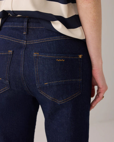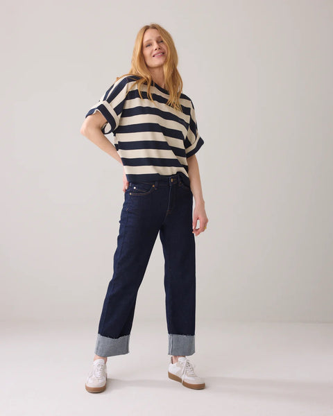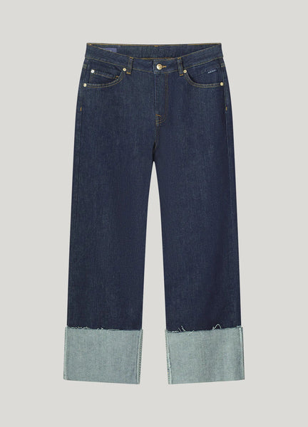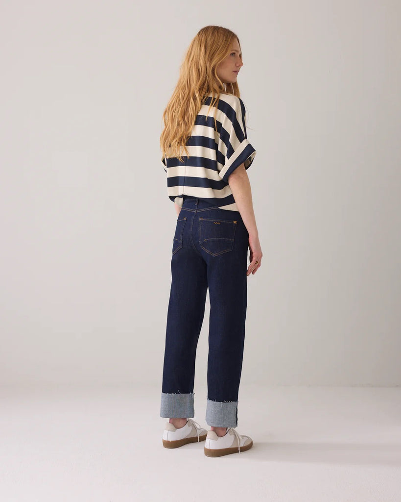 These straight-fit Sarin jeans are made of stretch denim and have a mid-rise waist. The trousers have a wide turned-up hem and a raw edge finish.