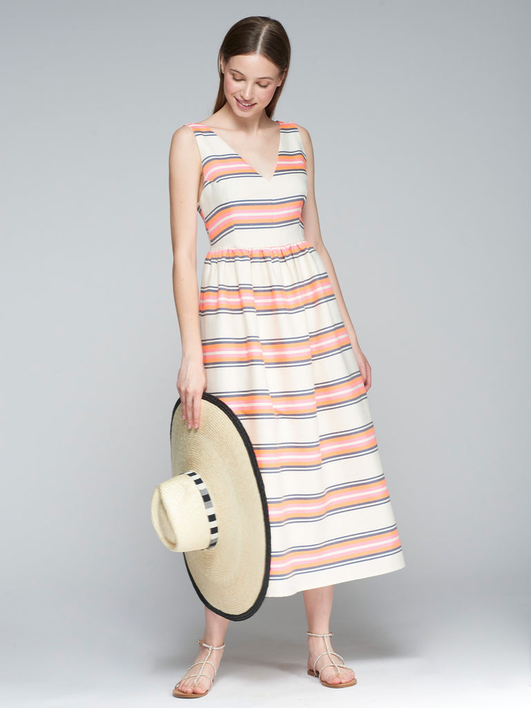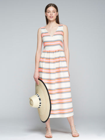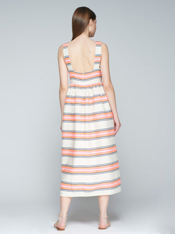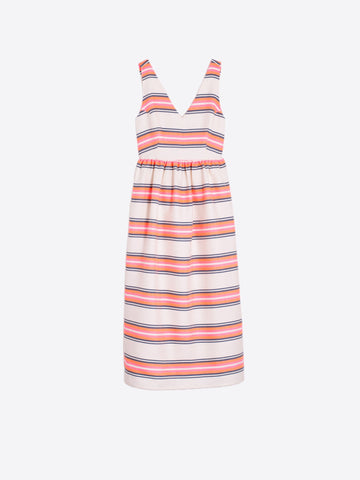 White midi dress with horizontal stripes in fluorescent and navy blue tones. V neckline. Sleeveless. Fitted body and flared skirt.